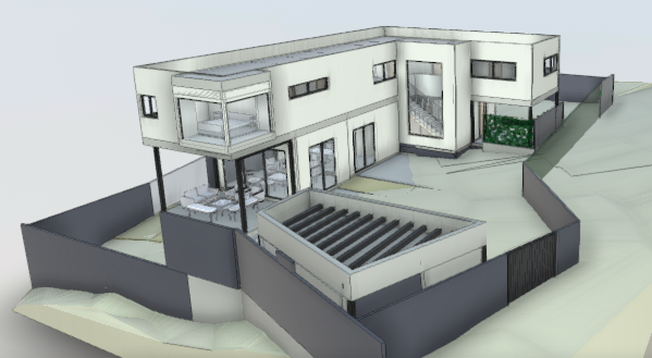 Casa de dos niveles con estructura de Paneles SIP y marcos de acero. Entrepiso compuesto con vigas I-JOIST y vigas reticuladas en voladizo.