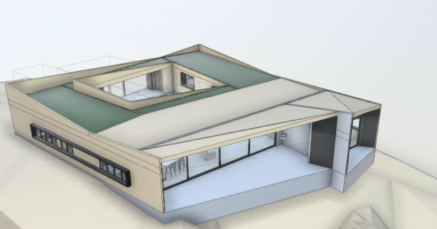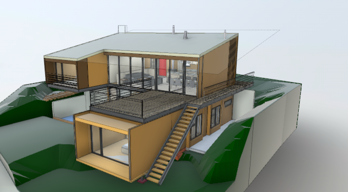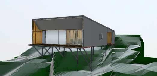 Estructura de dos niveles con sector en voladizo en dos sentidos, estructura en madera y marcos de acero.