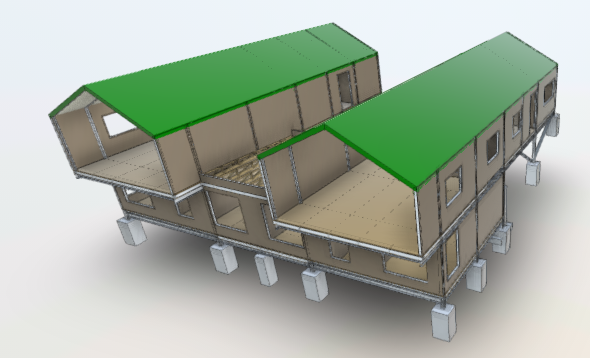 Estructura de dos niveles con marcos de acero, paneles SIP en muros y losa.